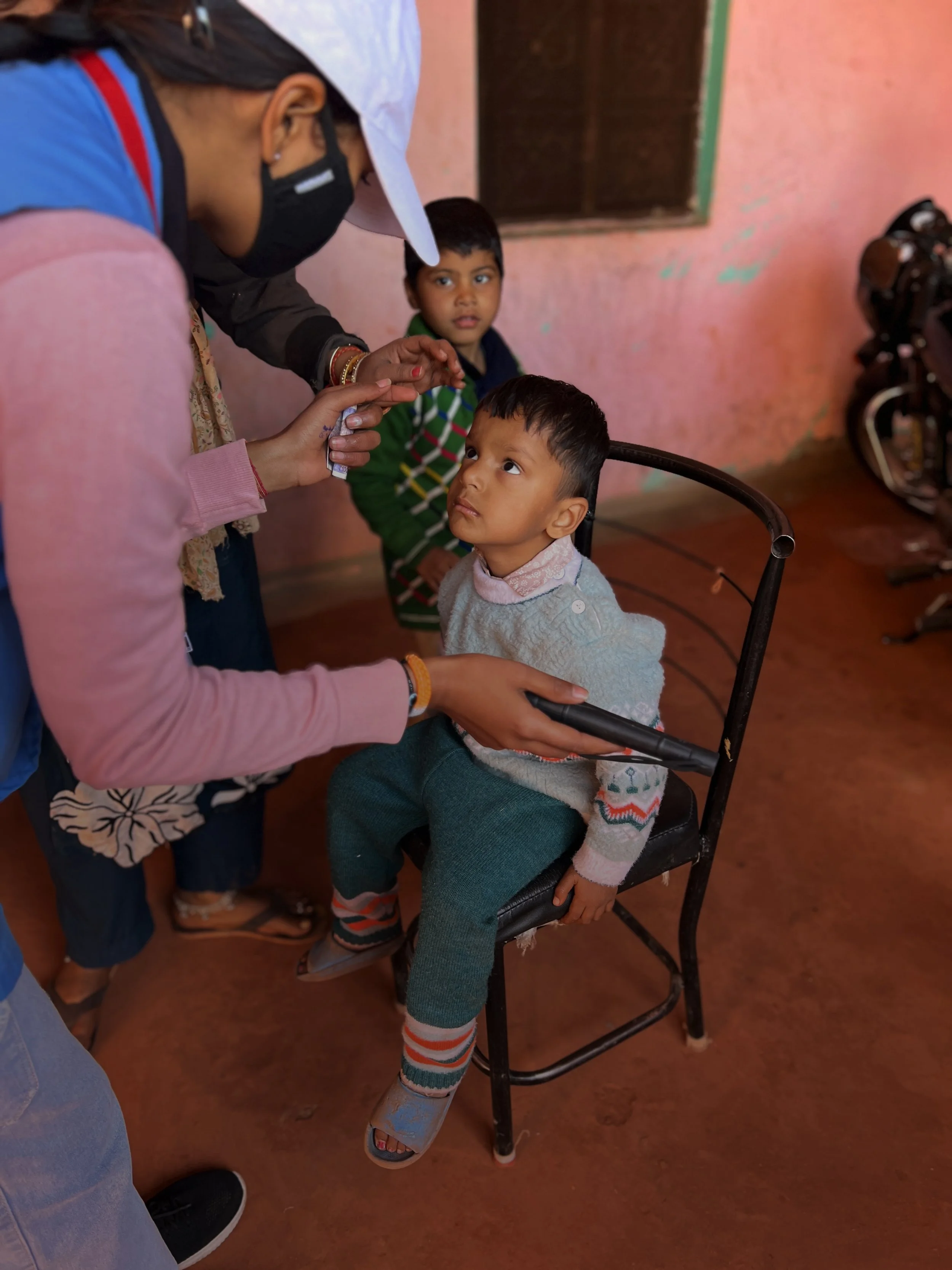 In this photo, an Aadya screener conducts a pediatric eye screening inside a young boy’s home. Through the Aadya Initiative, trained women go door to door in rural communities across India to identify vision problems early and connect patients with the care they need.